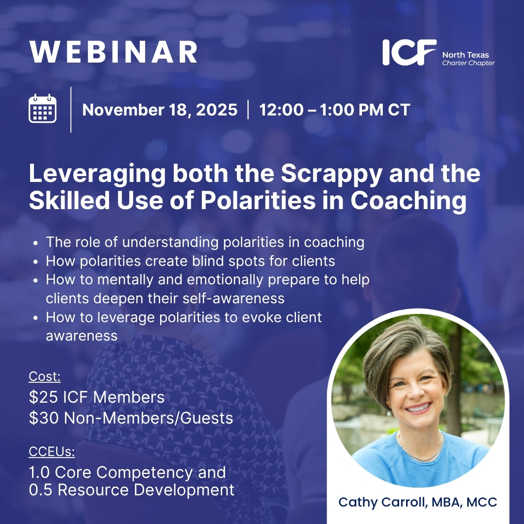 Bold and humble; task and relationship; support and challenge: These are polarities. Capitalizing on polarities in coaching is a superpower and can evoke meaningful awareness with clients. Without training, however, implementing this skill can feel intimidating. Join this session with Cathy Carroll, MCC to deepen your understanding of how to frame a polarity and improve your coaching skills. Through stories, Cathy will demonstrate how to use the very basics of polarities in both individual coaching and team coaching, and then she’ll recommend a variety of resources to facilitate coach growth from scrappy to skilled in this important coaching skill. No experience in polarities necessary.